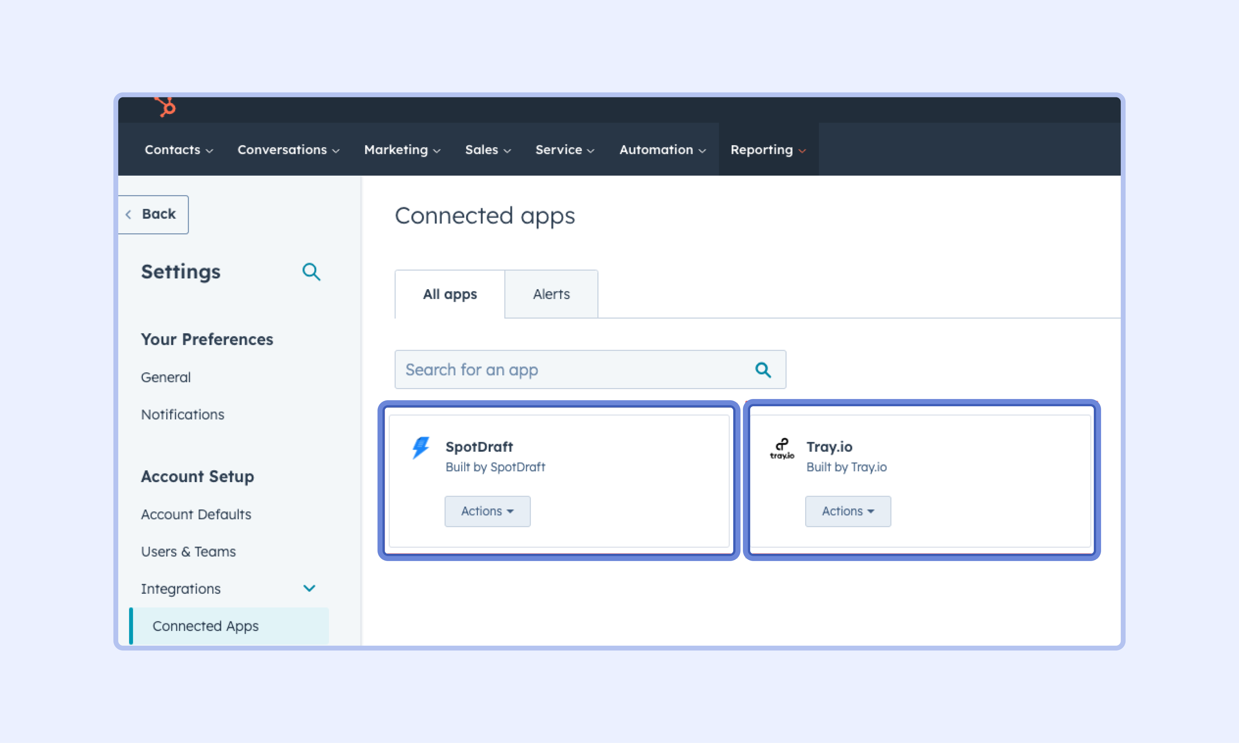 4 - Confirm the Installation by navigating to HubSpot’s Settings → Integrations → Connected Apps You should see the SpotDraft and the Tray.io Apps.