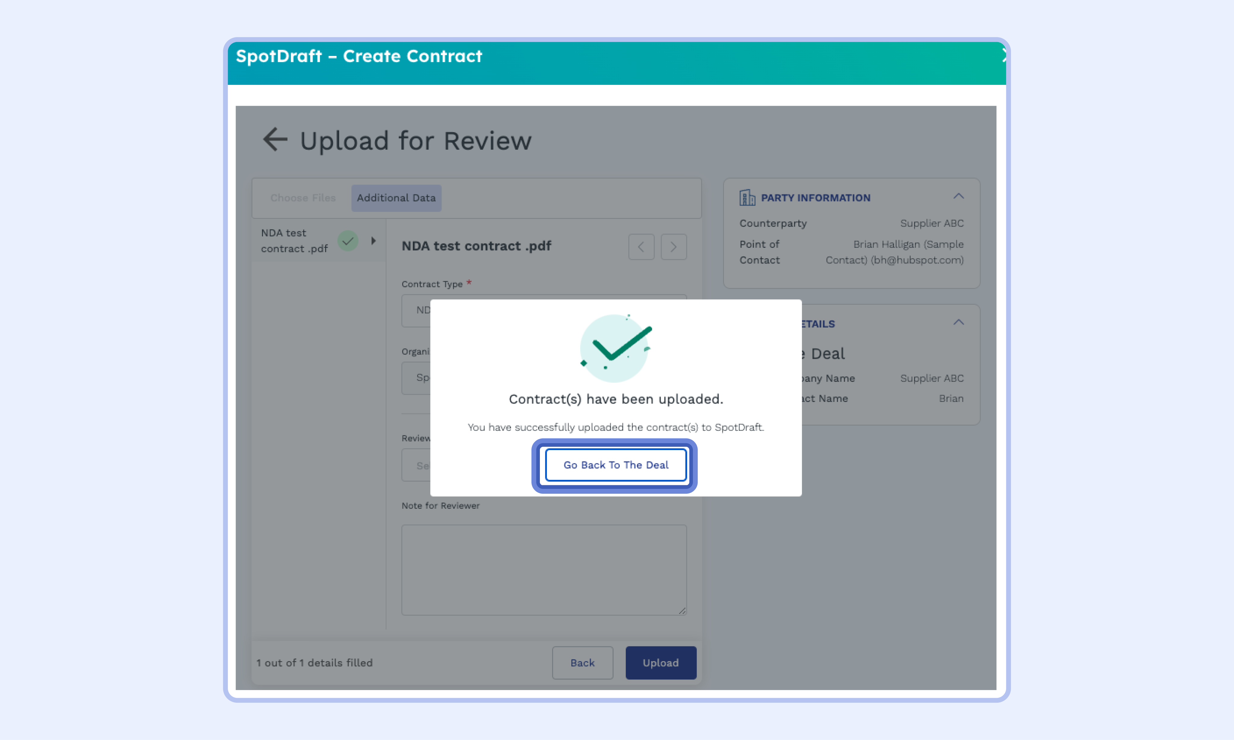 8 - Click Go Back To The Deal on the ‘Contract(s) have been uploaded’ success message.