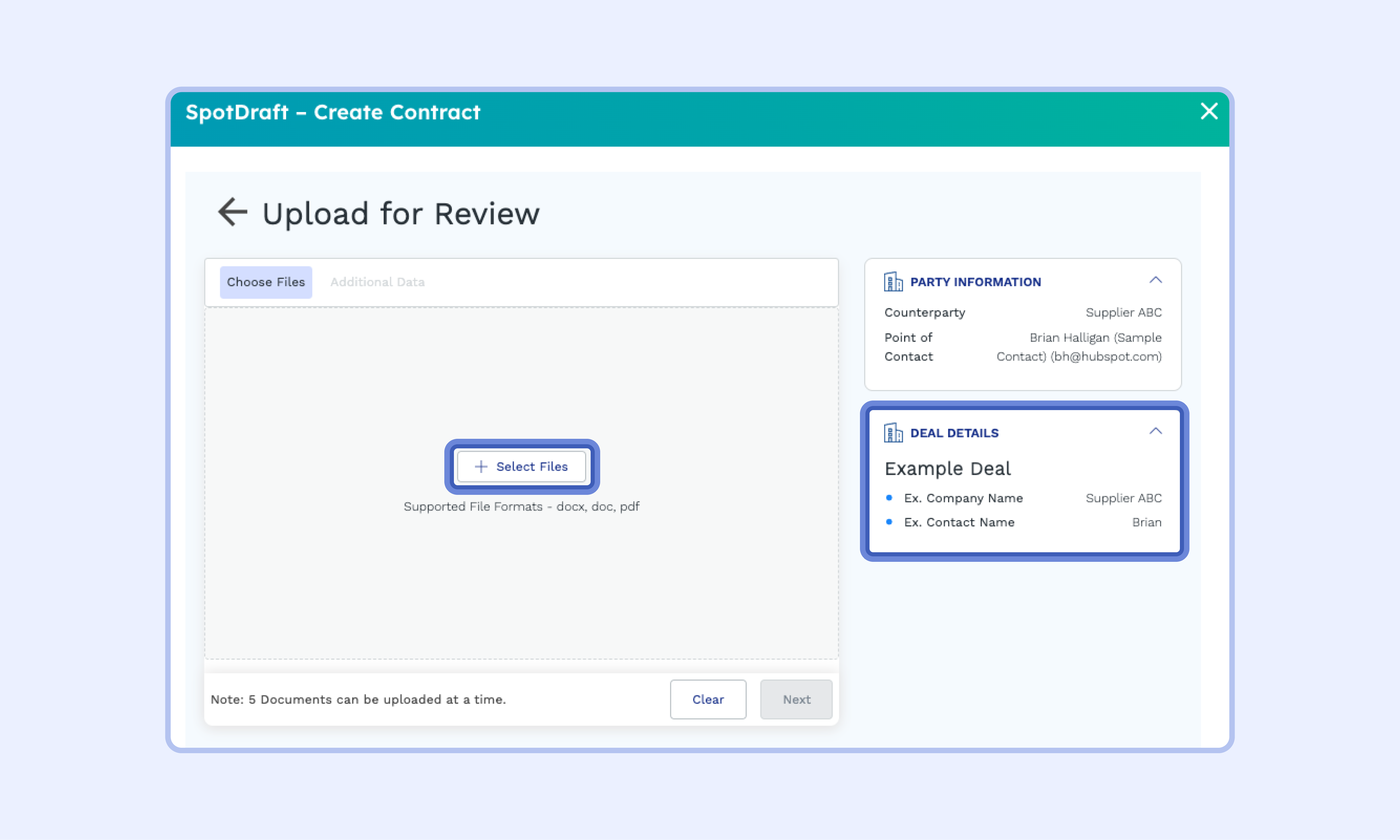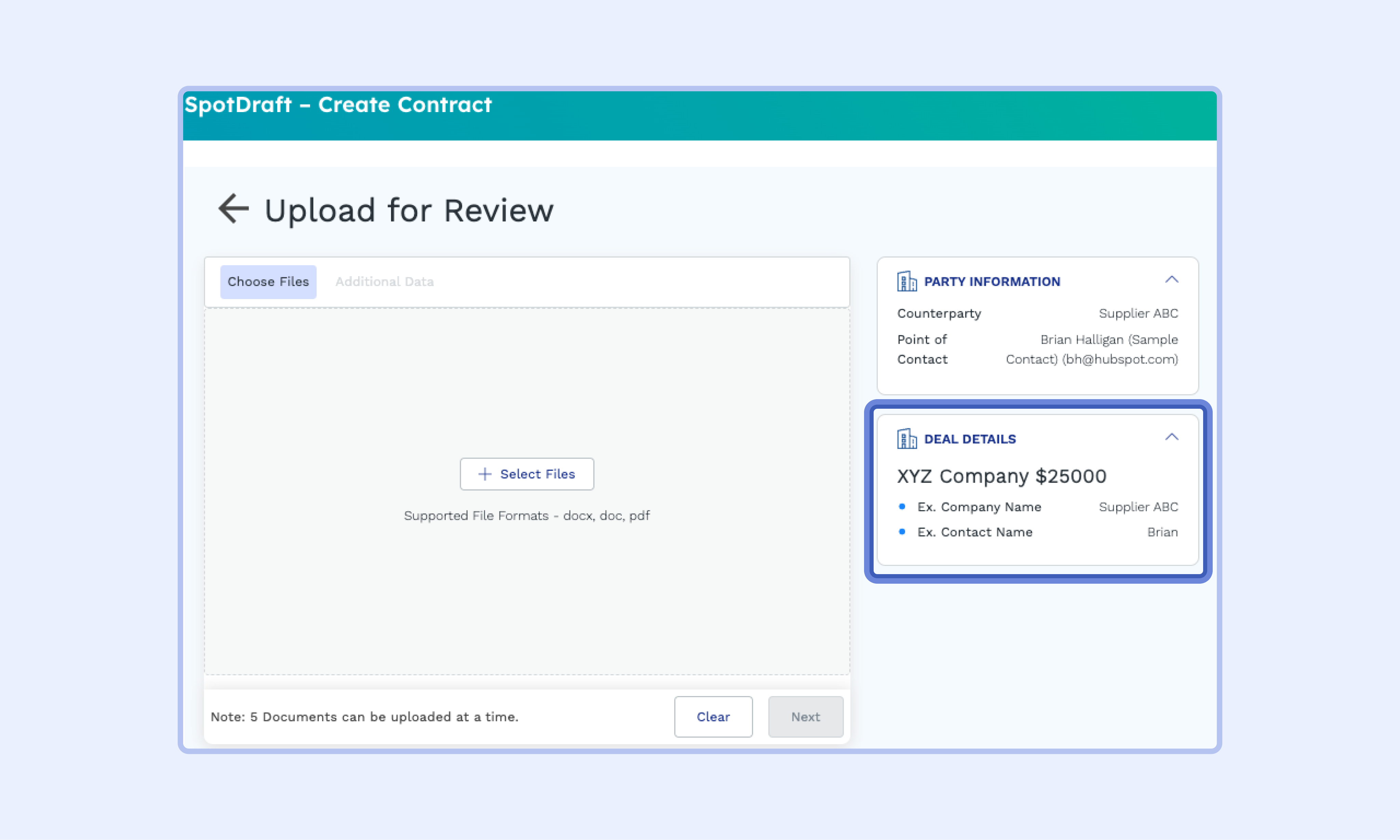 This configuration will enable you to start the contract review and execution process for Third Party Contracts directly from HubSpot. Once this is configured, you’ll be able to use SpotDraft’s ‘Upload for review’ workflow directly from HubSpot.