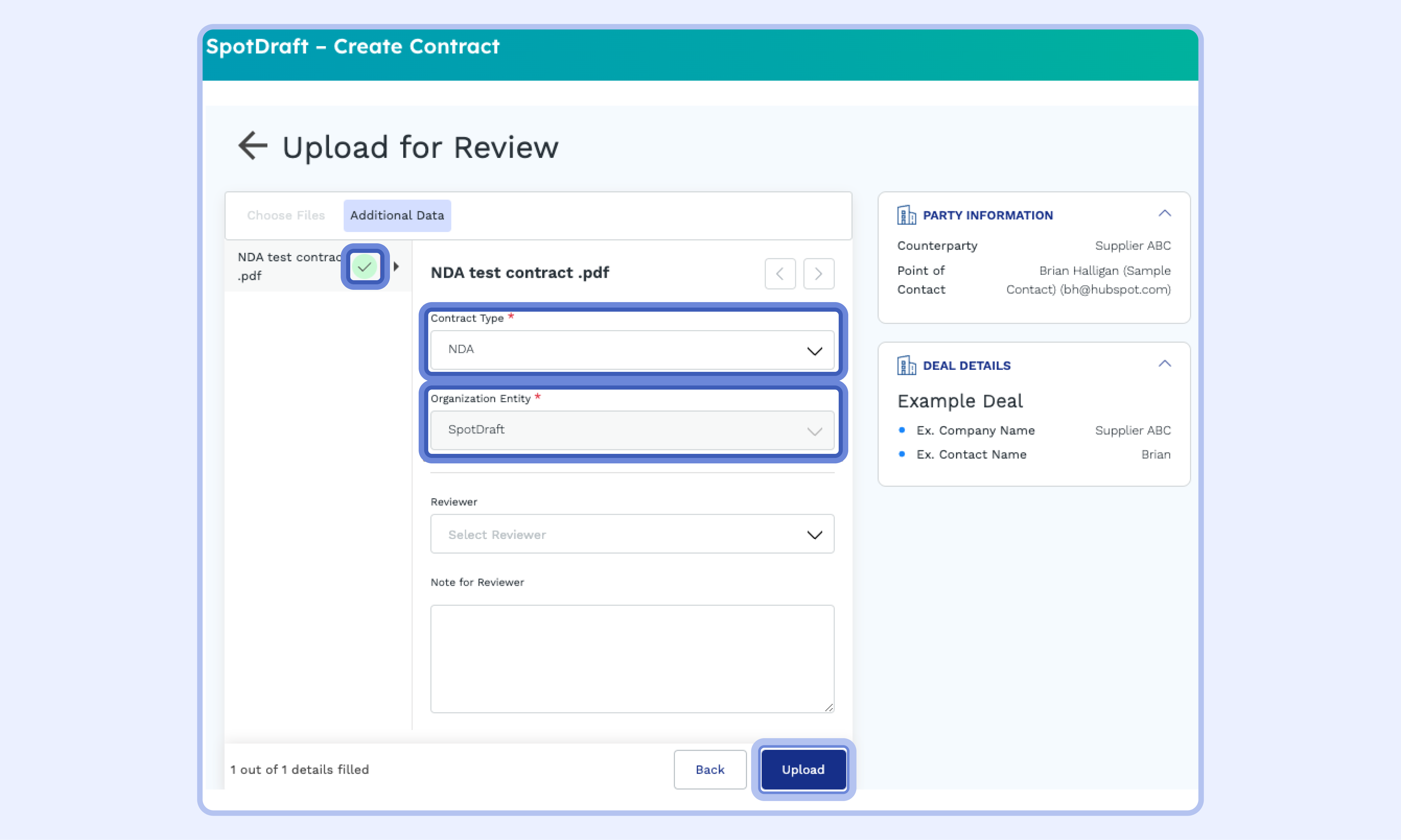🎉 Congratulations. The Integration to enable the ‘Upload for review’ workflow has been successfully verified. You can now use it to initiate the contract creation, review and execution process for Third Party Contracts.