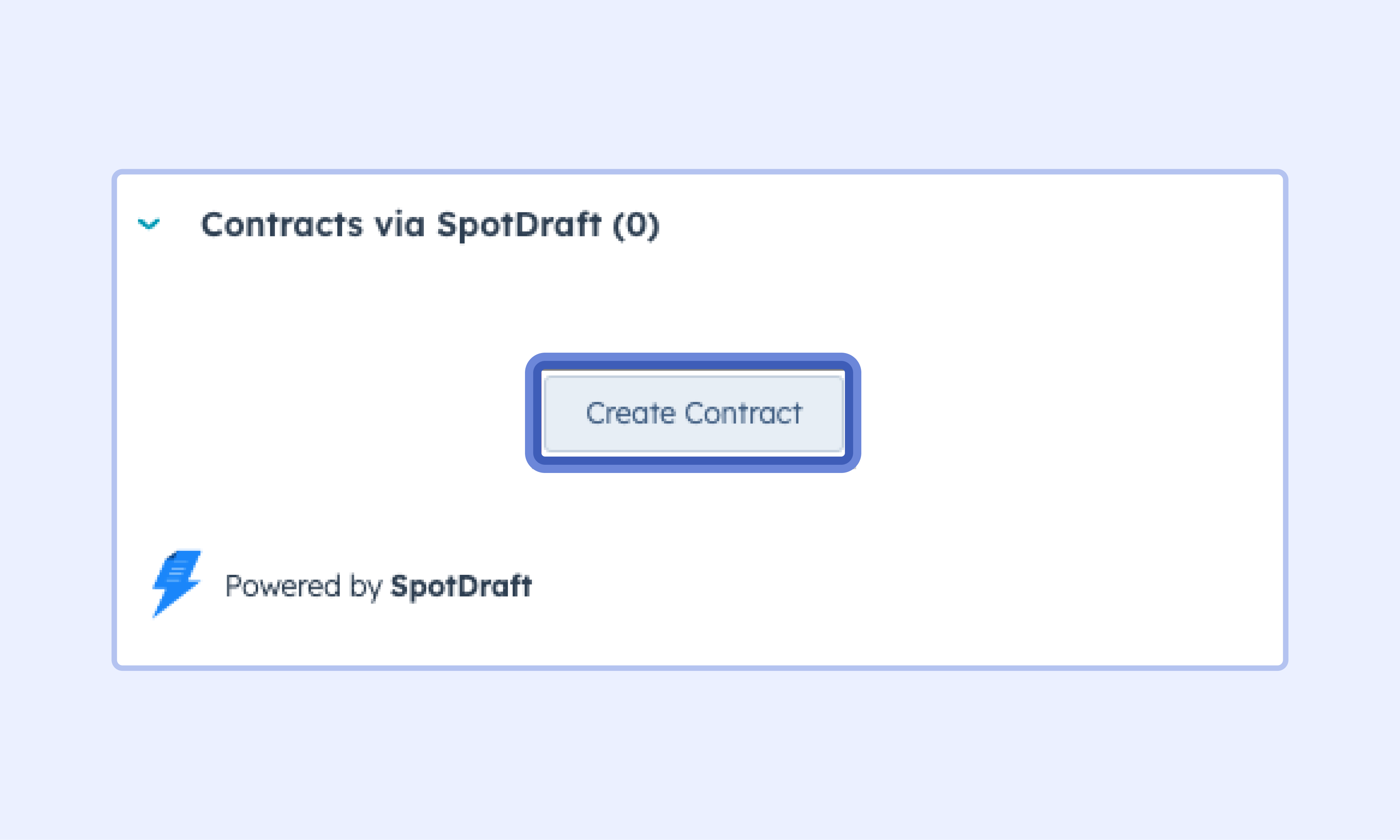 1 - Set up a test deal in HubSpot and on the right sidebar of the deal record, locate the ‘Contract by SpotDraft’ widget and click Create Contract.