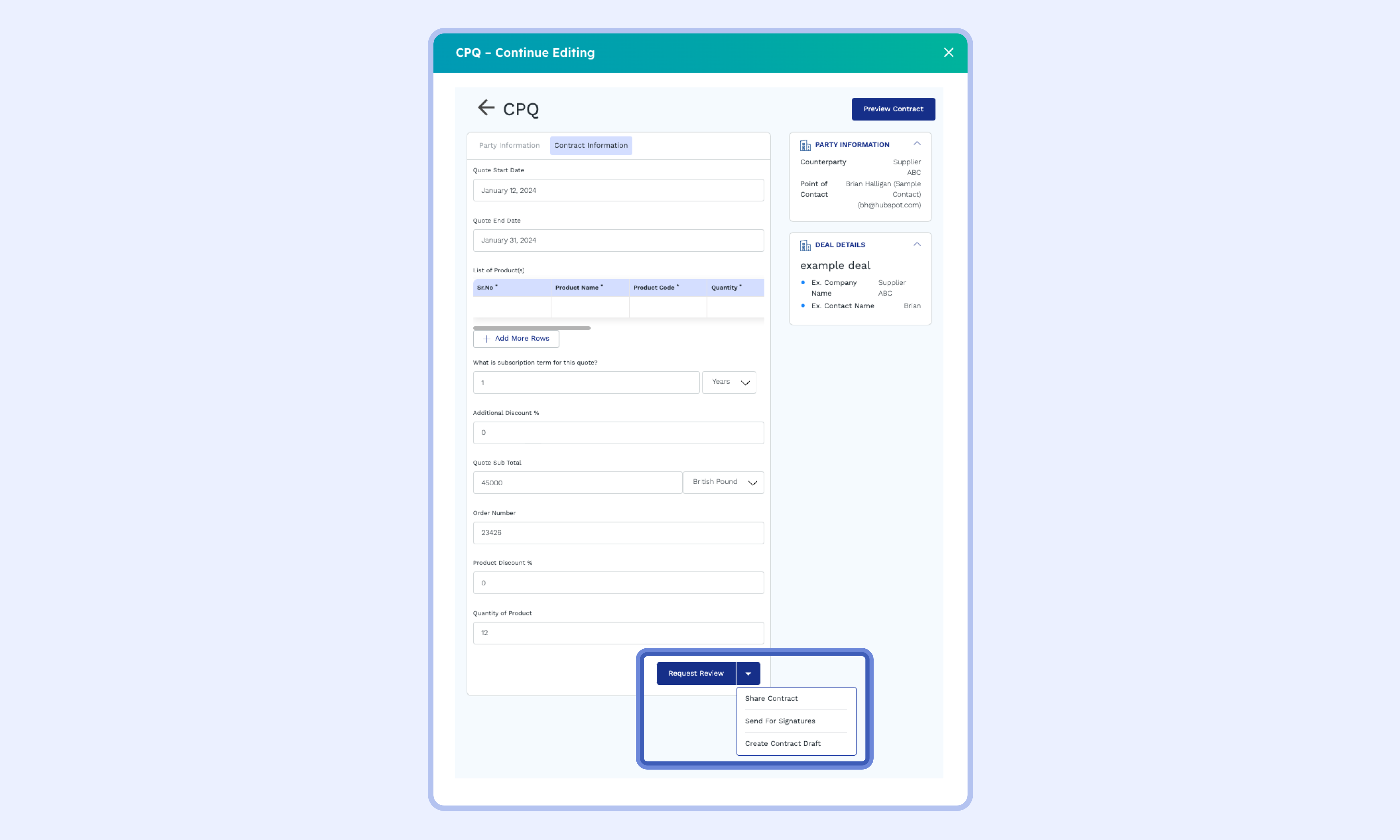 - Streamlined Contract Management: Initiate and manage contracts, such as NDAs and CPQs directly within HubSpot, accelerating the contract initiation process.