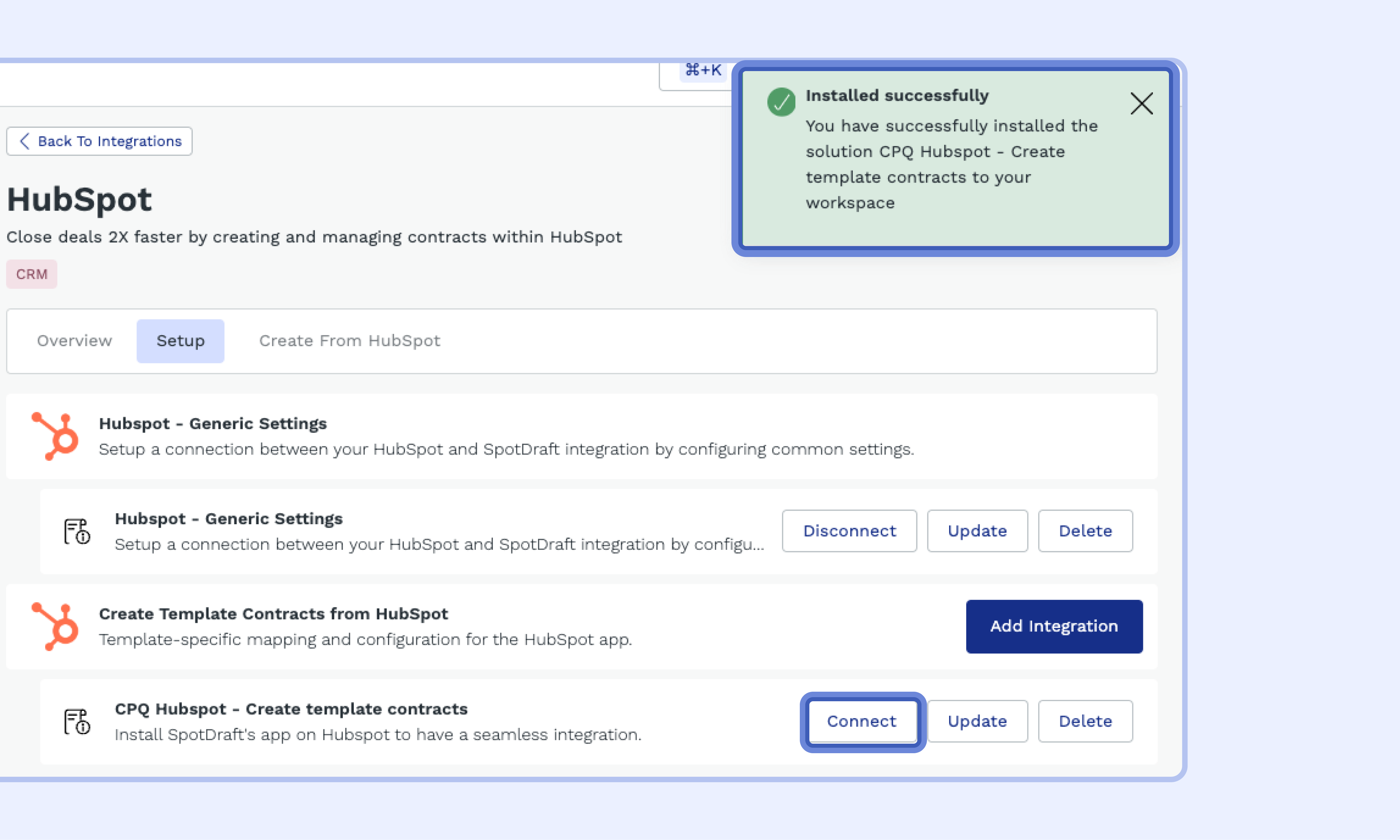 Congratulations on successfully setting up the HubSpot and SpotDraft integration! You have taken a significant step towards optimizing your contract management and sales processes. With this integration, your business is now equipped to seamlessly create, track, and manage contracts directly within HubSpot, enhancing efficiency and reducing the sales cycle.
