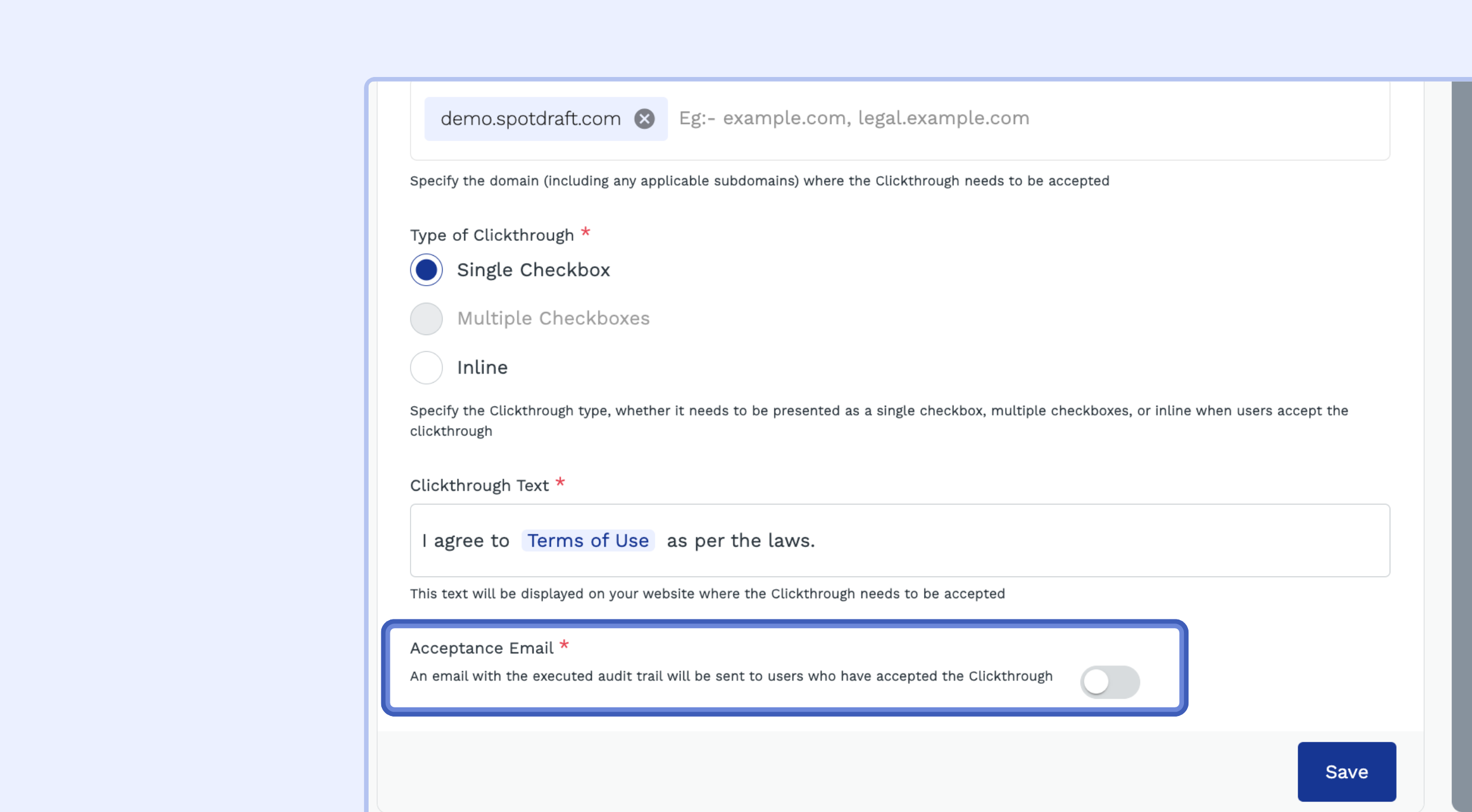 Save Your Changes: When you've made the desired changes, click the "Save" button. SpotDraft will automatically update your Clickthrough settings.