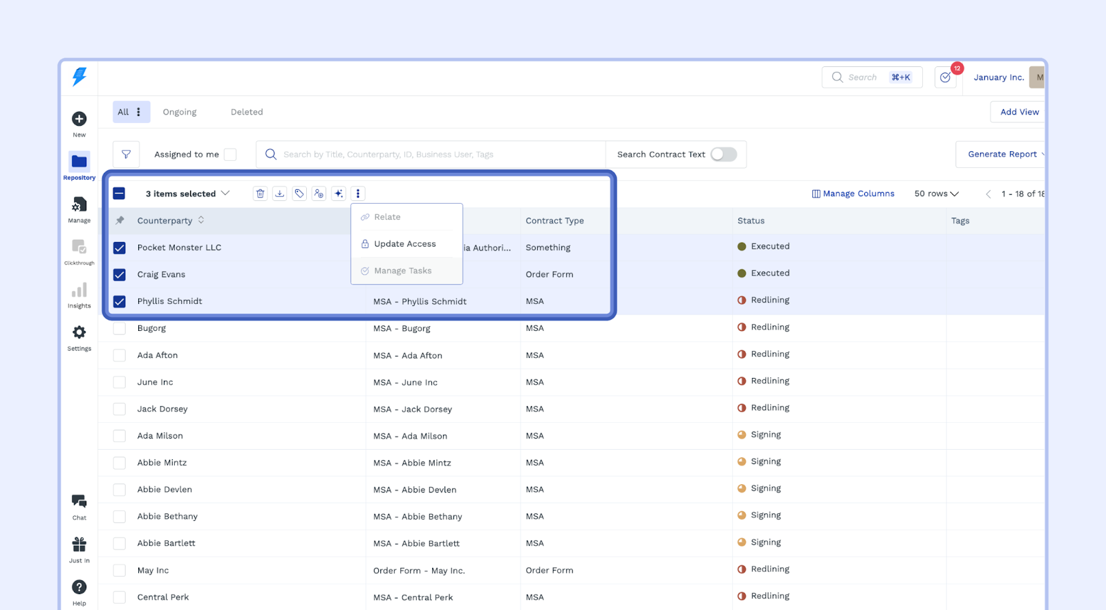 - Update Access: Adjust permissions and access levels for selected contracts.