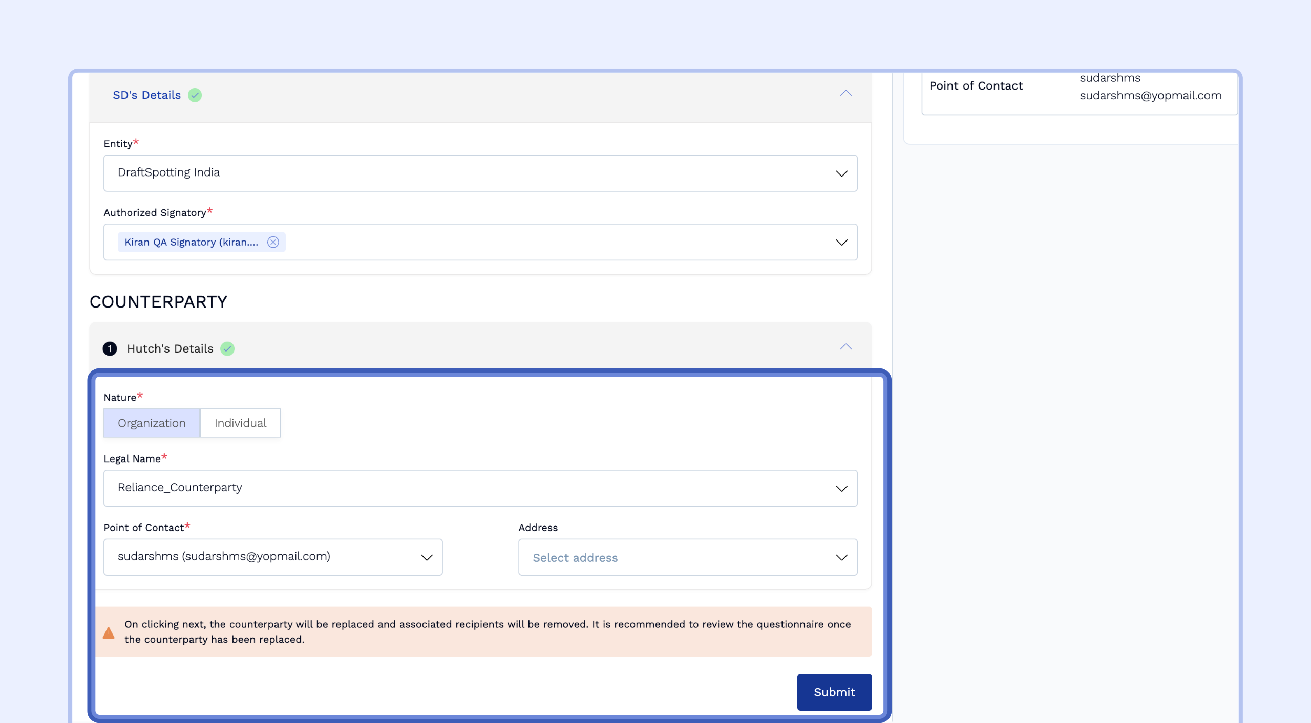 - On Clicking replace counterparty you’ll enter the Questionnaire flow to select existing or create a new counterparty