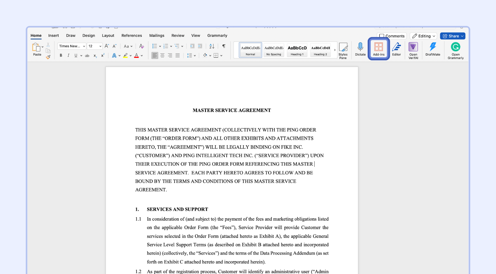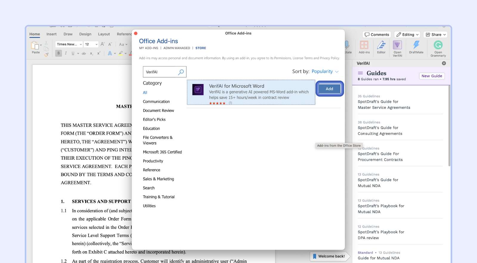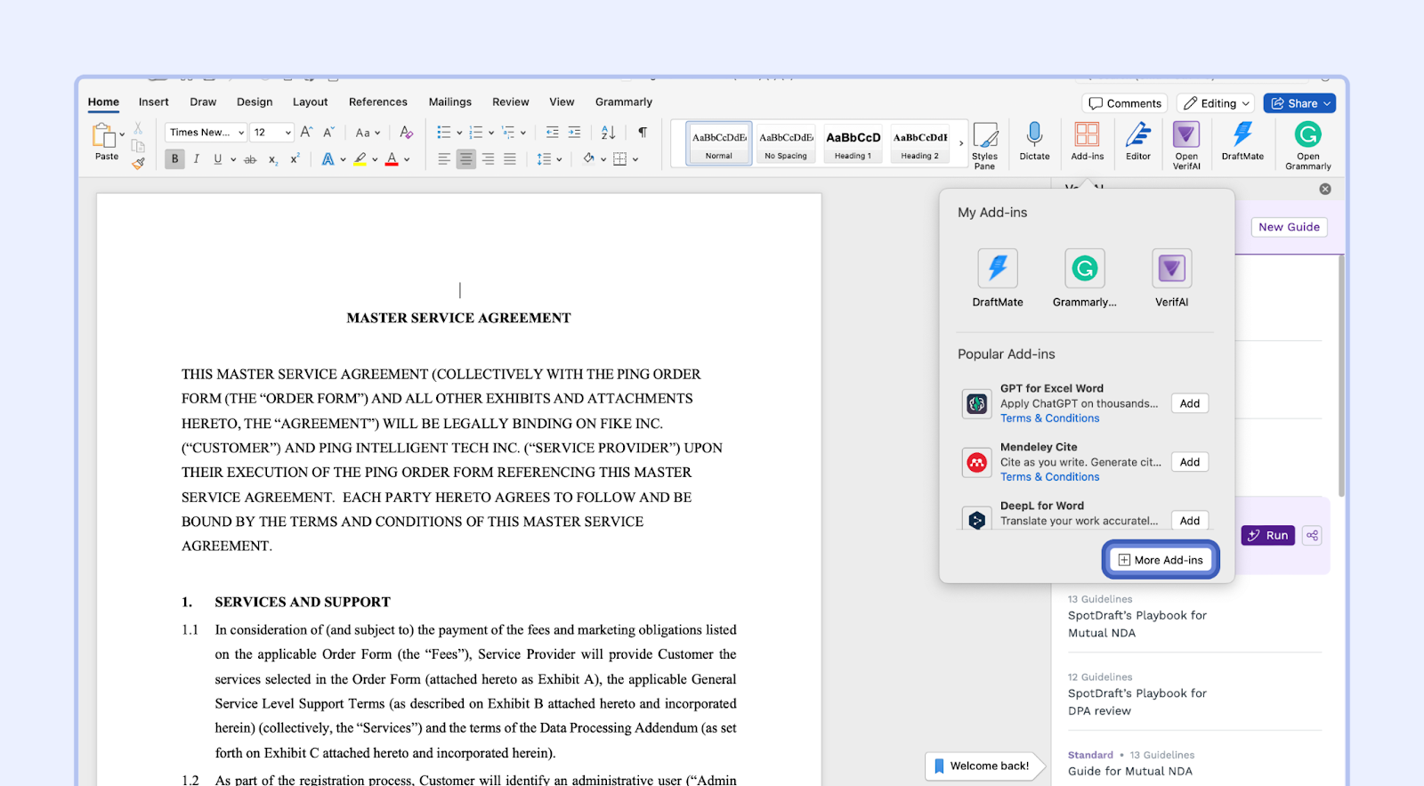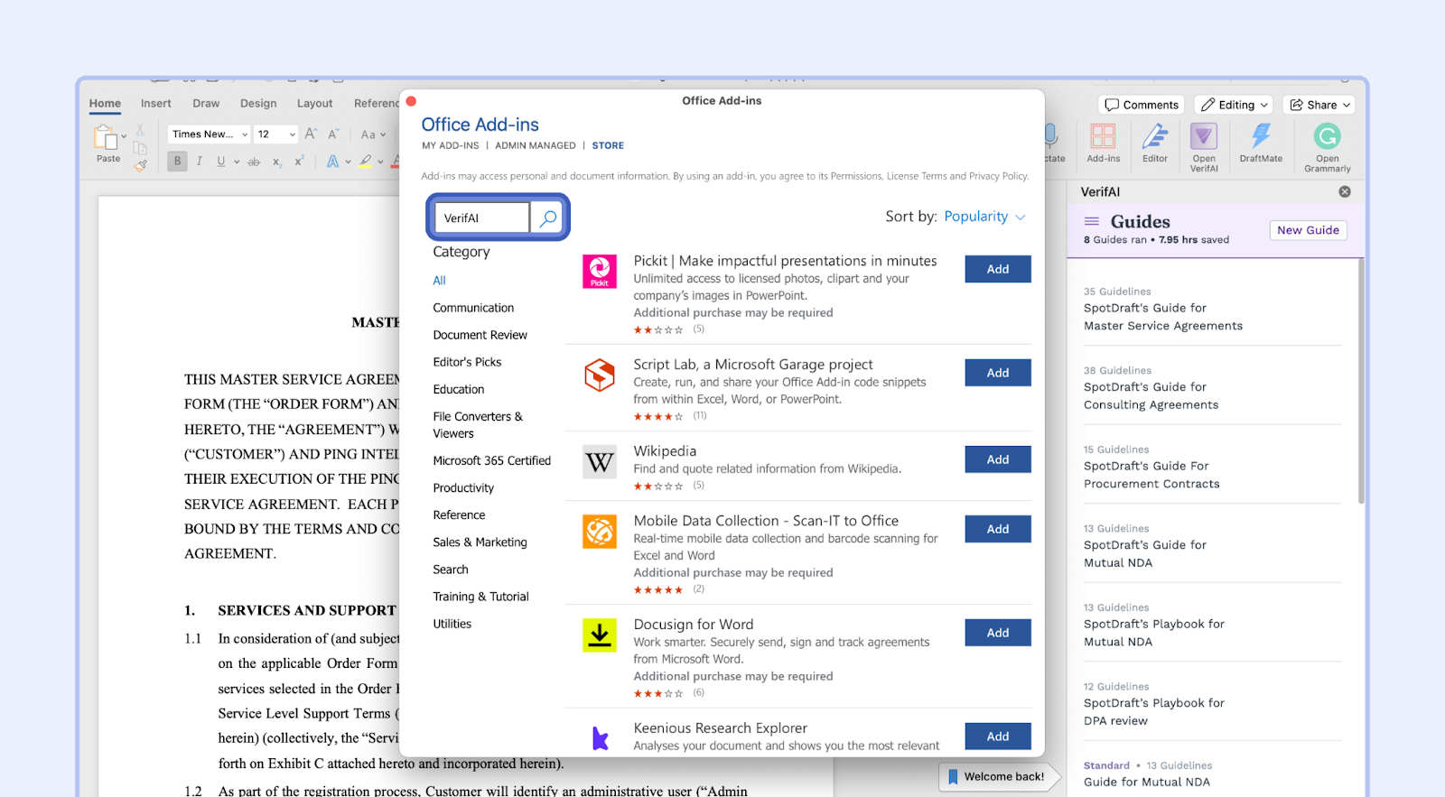 VerifAI is a SpotDraft add-in for Microsoft Word that can help lawyers review contracts 15x faster. It's designed to work seamlessly on all Microsoft Word platforms, including the desktop application, Microsoft Word Online, and the Microsoft Word Editor in SpotDraft.